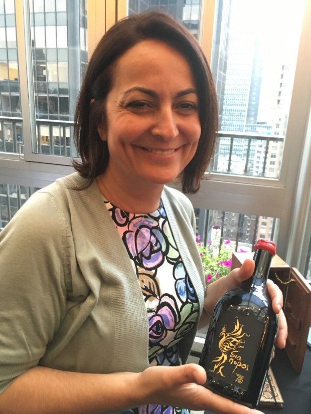 Dionysi and Dionysia Brintziki, founders and owners of Ktima Brintziki celebrated the worldwide release of Dia Pyros this week in New York. “Dia Pyros,” meaning “from the fire” has a truly remarkable story of its grapes surviving the terrible “Greek Hellfires” of 2007 when the Brintzikis remember how over 3000 fires raged across Greece scorching 670,000 acres of land making it the worst fire season on record in the past 50 years in Greece. The fires even reached Brintziki Vineyards outside Ancient Olympia, and while the vineyards weren’t spared, the grapes somehow still survived through the scorching flames. Ktima Brintziki has captured the uniqueness of vinifying these grapes which have undergone such an extreme situation and after one long years of aging, they have come out with a wine that truly one of a kind. Upstairs at Kimberly Hotel was packed with Greeks and non-Greeks alike who came out to support the Brintziki Winery. Groups of New York food bloggers, including Daska Navia from Tater Thoughts, gathered together to reflect in the gathering and raise their wine glasses in salute to the incredible story behind Dia Pyros. Dean Gamanos, founder of Greenwich Wine Society in Connecticut, raved about how Greek wines are finally being discovered in America and how happy he was to support the event. As an organic winery and the first green and energy friendly winery in Greece, Brintziki Winery and the couple behind it, the Britzikis are also proud of the fact that they can now share their wine with the rest of the world and tell the miraculous story of how their grapes came through the fire to tell this story. Being released are 2300 individually numbered bottle of Dia Pyros, which are wax sealed bearing the handwritten signature of Dionysis and the oenologist George Kotseridis. More information is available at brintzikis.com.